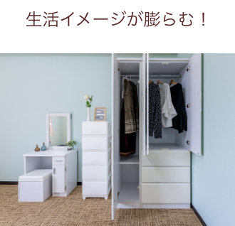 お部屋は7畳の個室、10畳の個室、10畳の2人部屋の3タイプ。お部屋にはベッドやデスク、ドレッサー、収納があり、一人暮らしに必要な家具を自分で買うことなく生活が始められます。